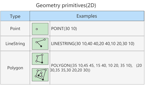 | 空间数据类型 | 单值类型: GEOMETRY、 POINT、 LINESTRING、 POLYGON; 集合类型: MULTIPOINT、 MULTILINESTRING、 MULTIPOLYGON、 GEOMETRYCOLLECTION |