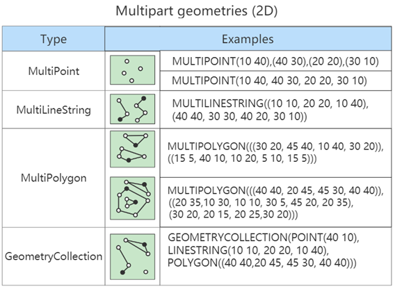 MultiPoint、MultiLineString、MultiPolygon、GeometryCollection 这4种类型都是集合类,是多个Point、LineString或Polygon组合而成。
